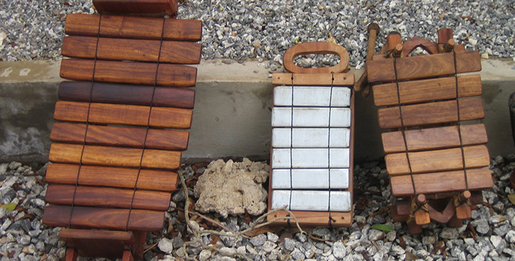 Handcrafted wooden balafons tuned traditionally and supported by calabash resonators for rich, earthy tones.